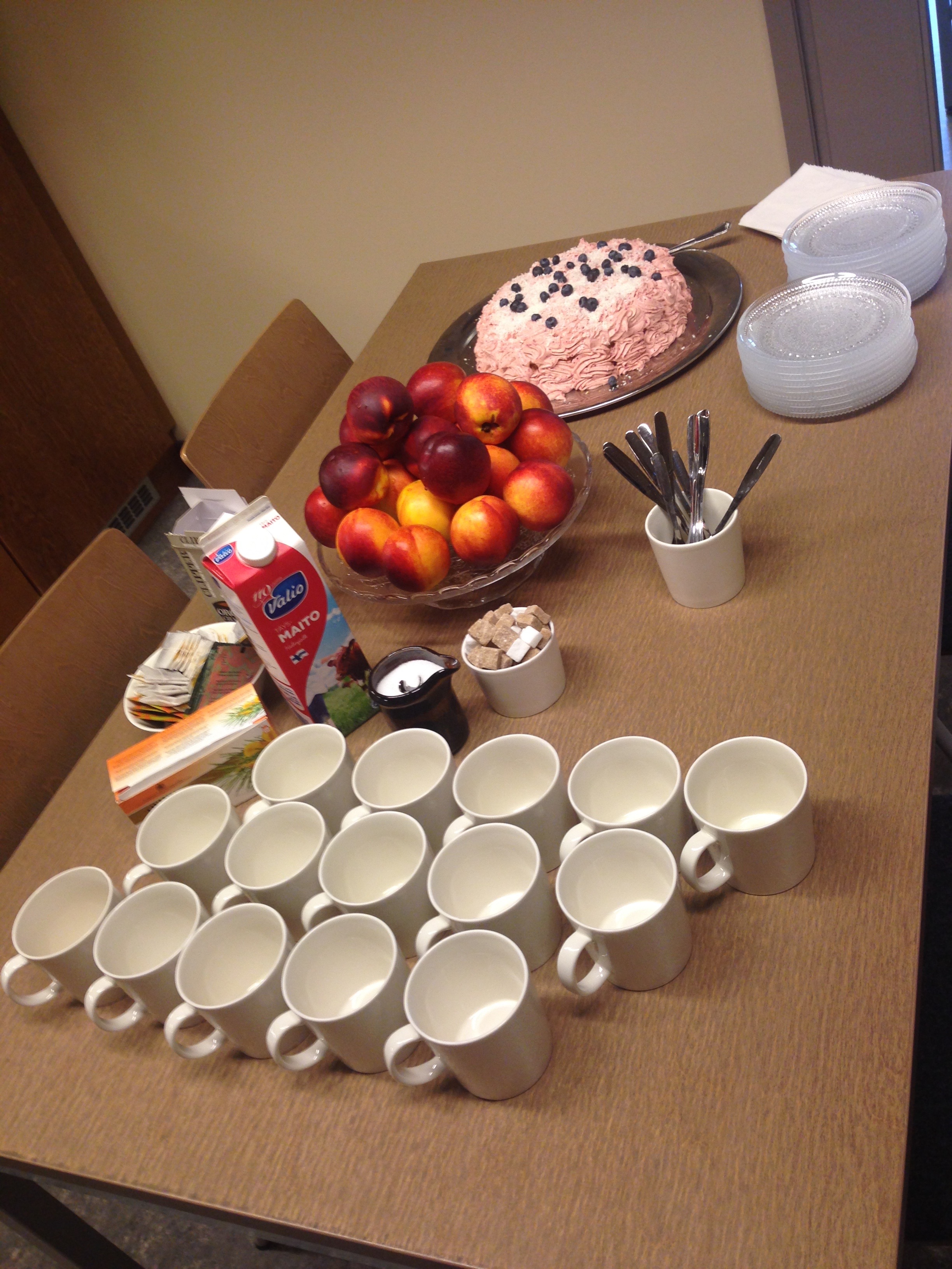Here is a picture of the food that was served at my first department meeting in Finland. This cake was fantastic, and the nectarines were so fresh.