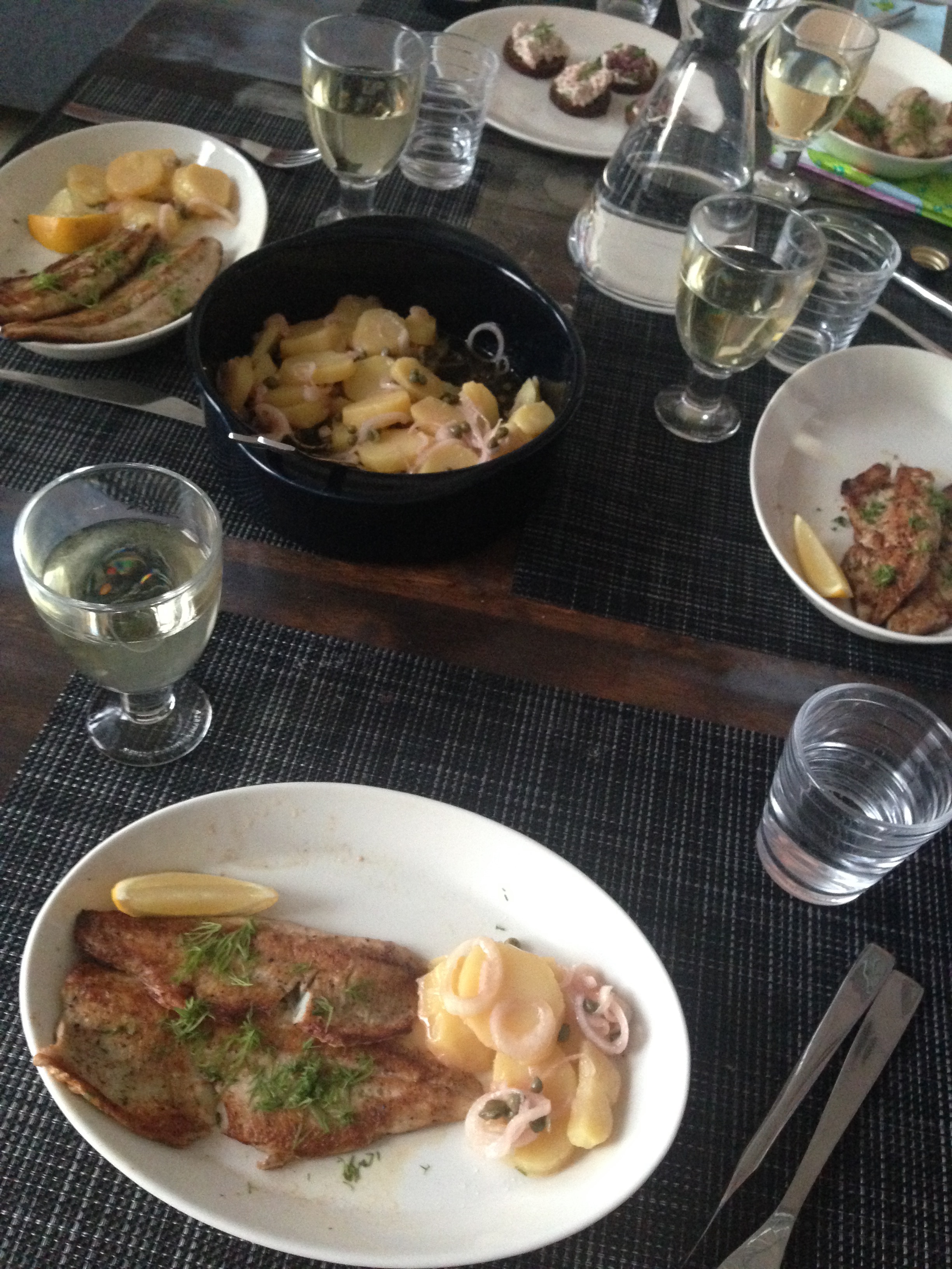 Here is a delicious dinner of a type of white fish flash fried in butter, and served with potato & pickled onion salad. This delightful meal was generously served to us by my Fulbright buddy (a program where Fulbright Finland pairs visiting U.S. scholars with Finnish scholars who have had Fulbright awards in the U.S.) and her husband, a theatre director. At this meal I also had my first Chilean Riesling–thank you, Finland!